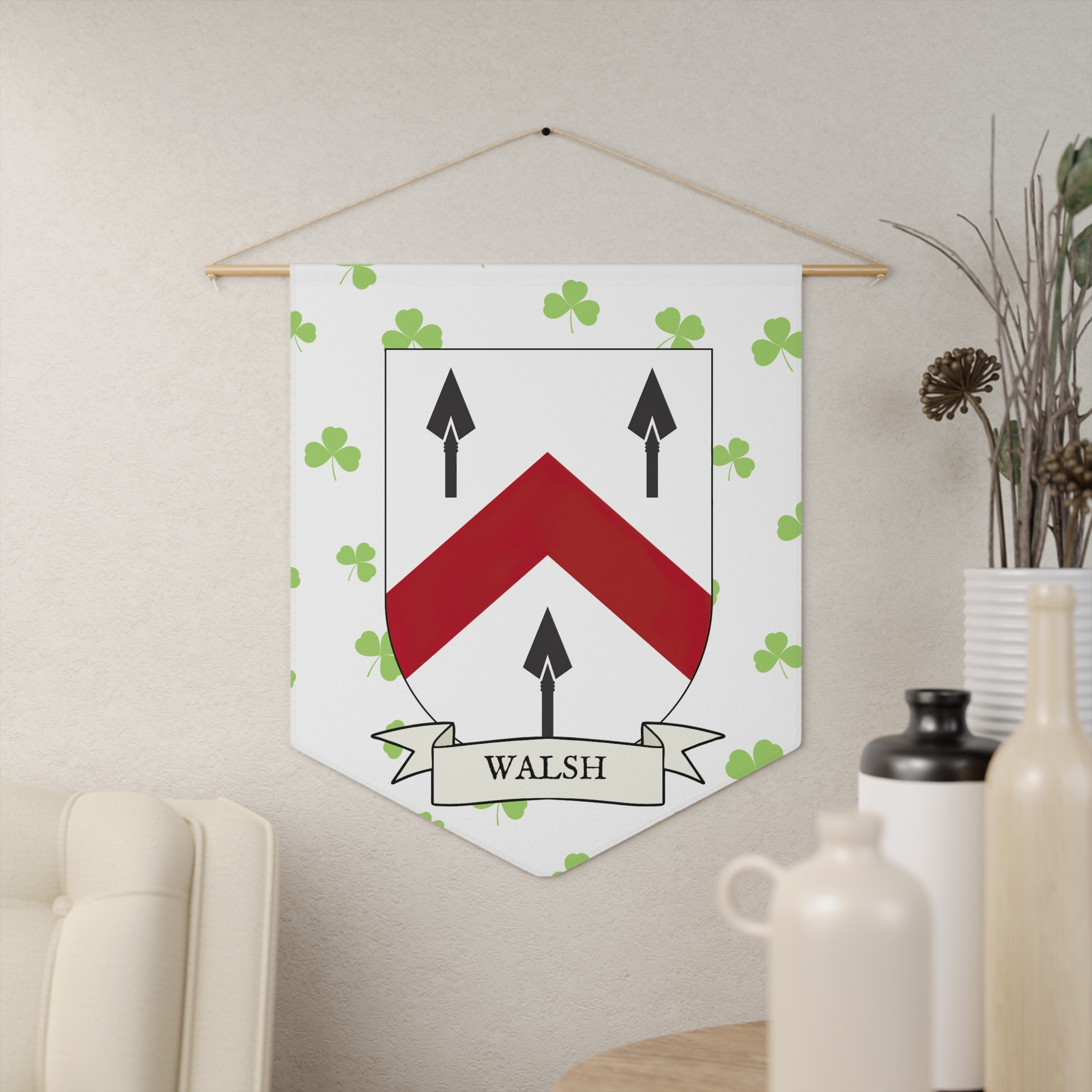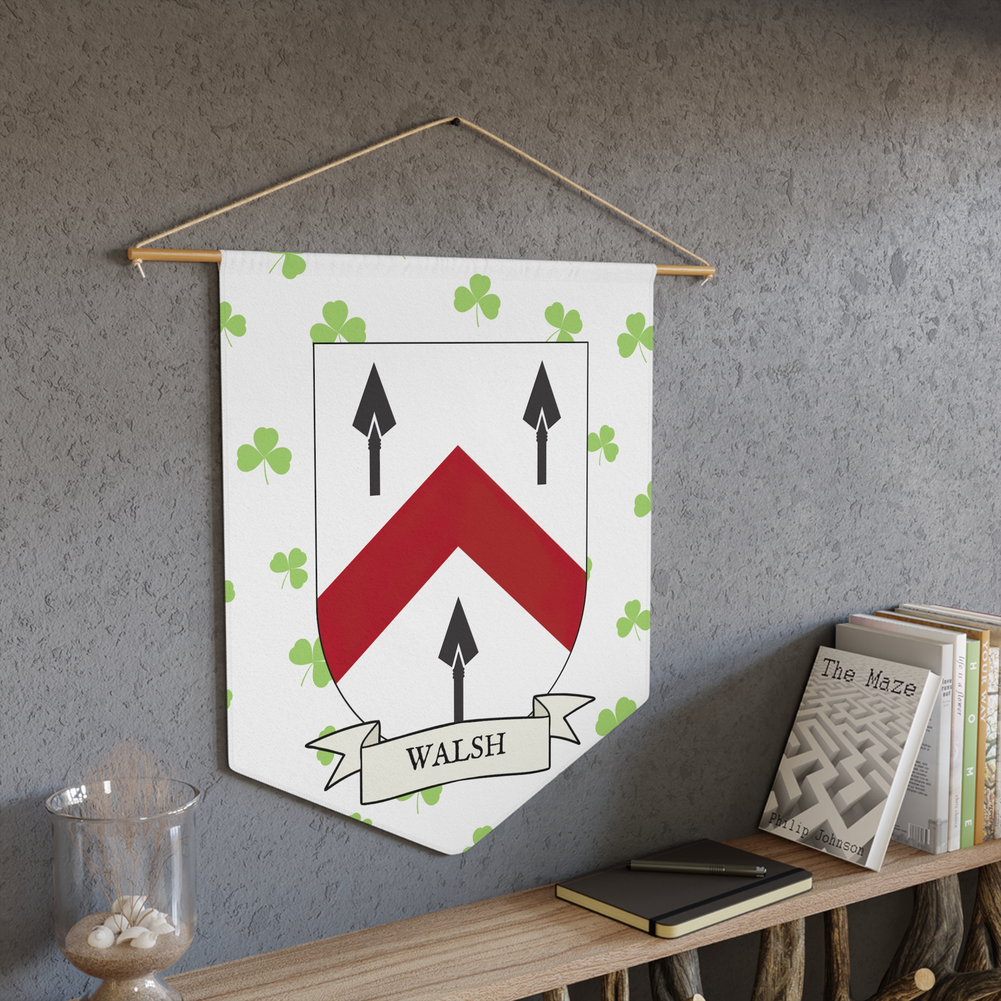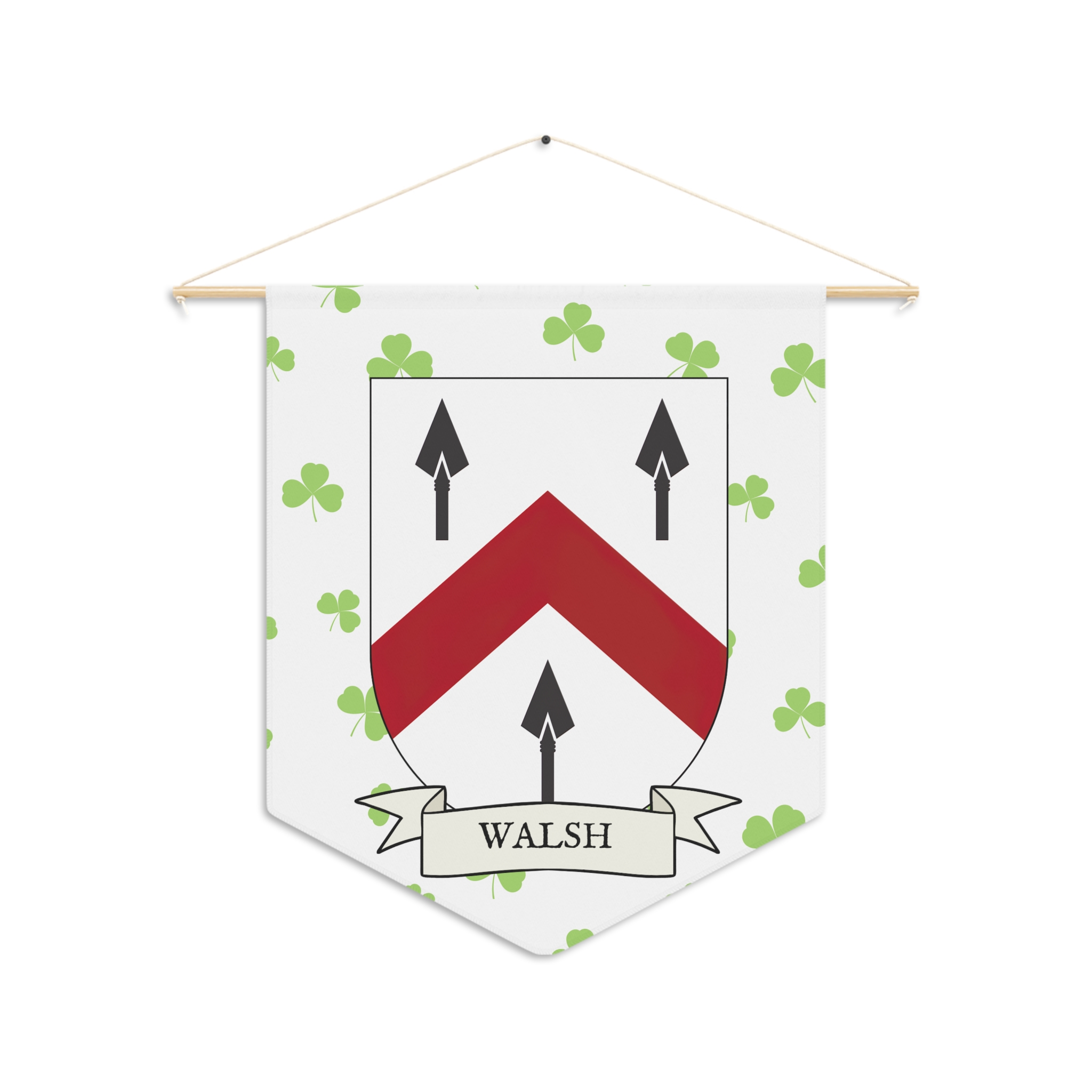 Uplift any room and show off your Irish American roots with this Walsh Family Coat of Arms Indoor Pennant. Pennant is printed on durable poly twill and comes with a wooden dowel/twine frame for easy hanging. Features your family Coat of Arms printed over a restrained shamrock patterned background.
