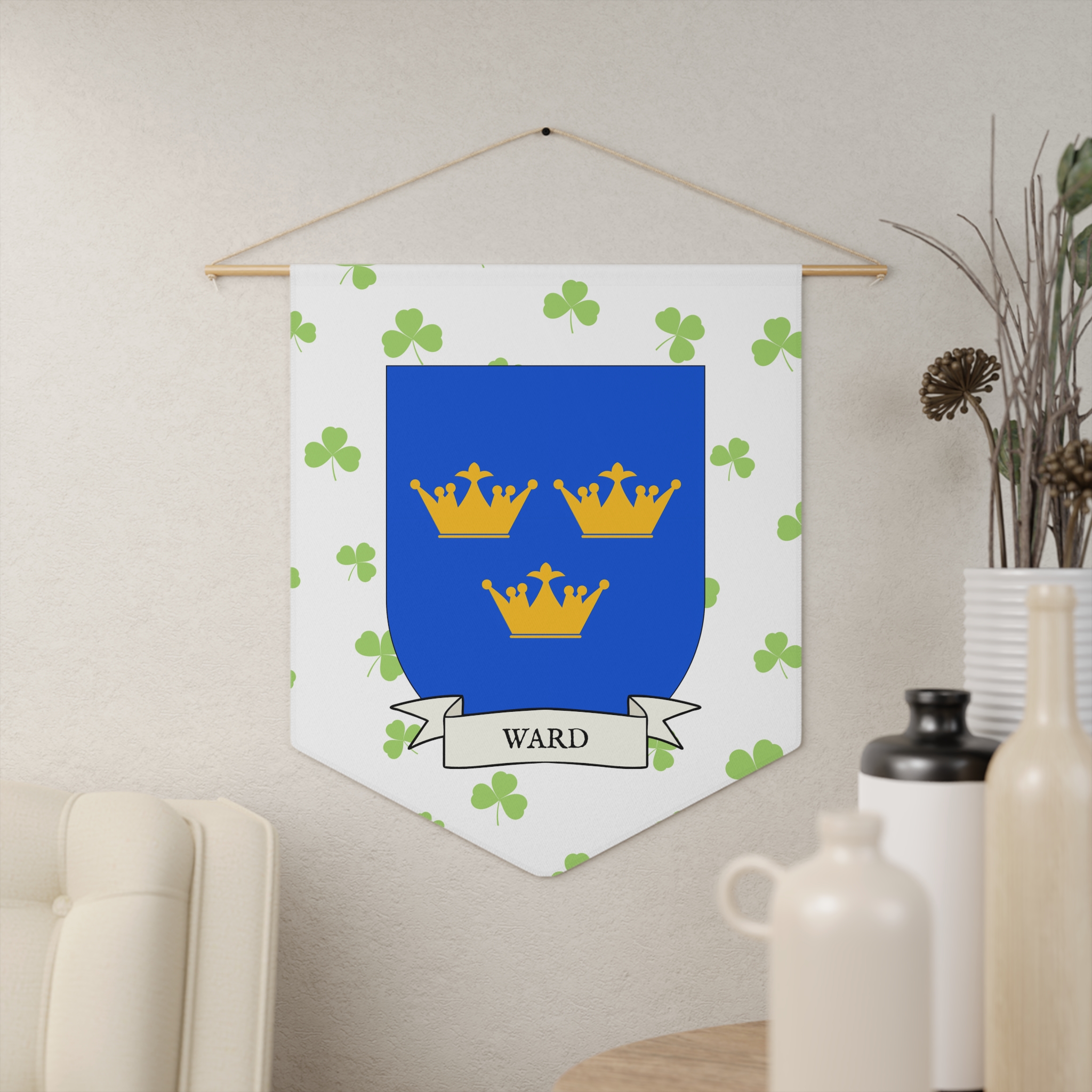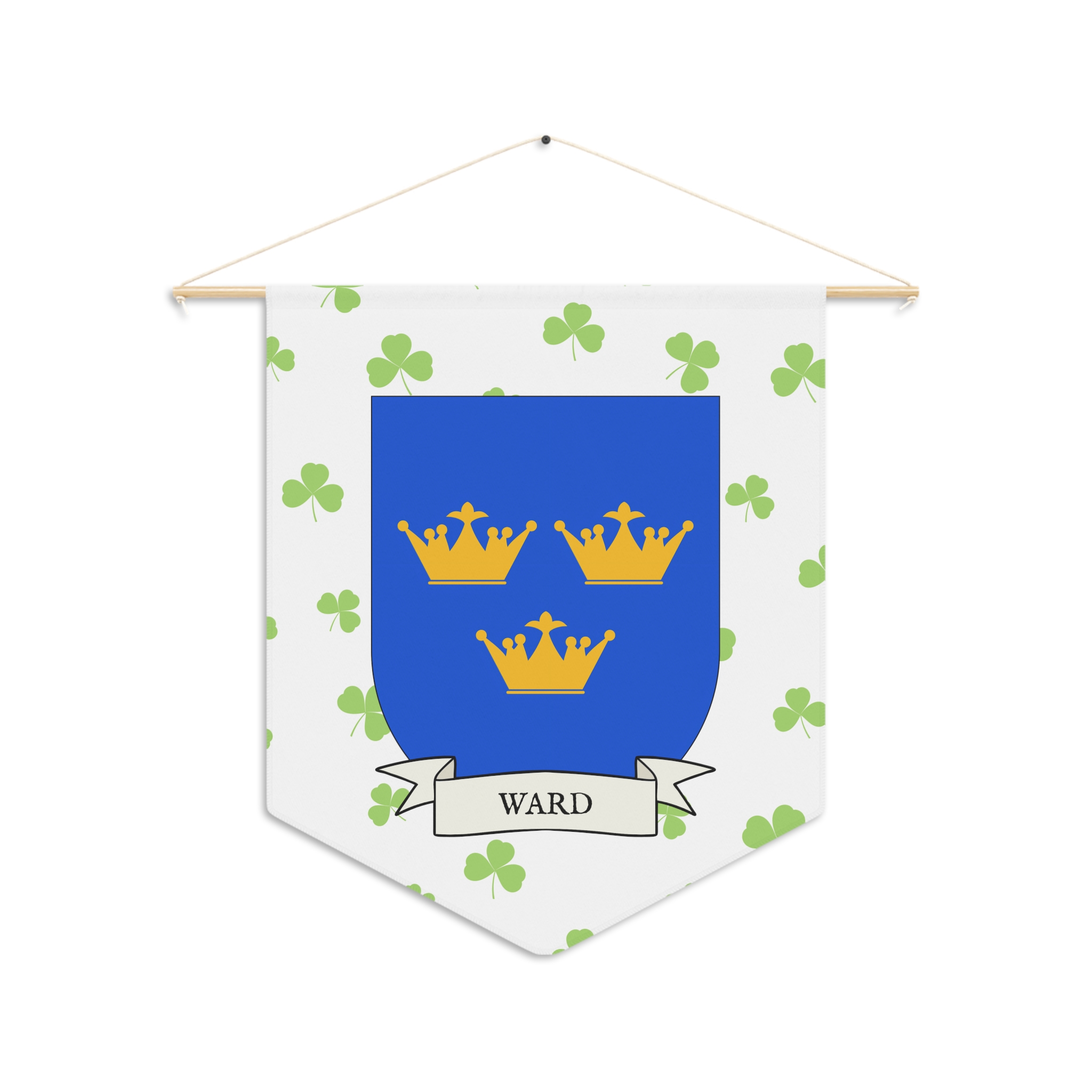 Uplift any room and show off your Irish American roots with this Ward Family Coat of Arms Indoor Pennant. Pennant is printed on durable poly twill and comes with a wooden dowel/twine frame for easy hanging. Features your family Coat of Arms printed over a restrained shamrock patterned background.