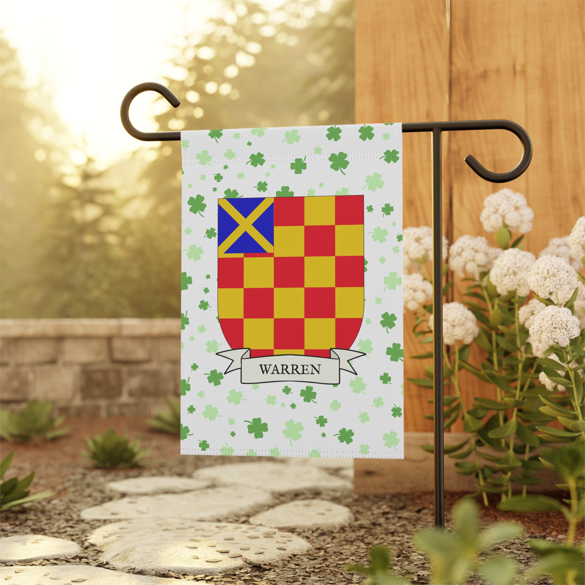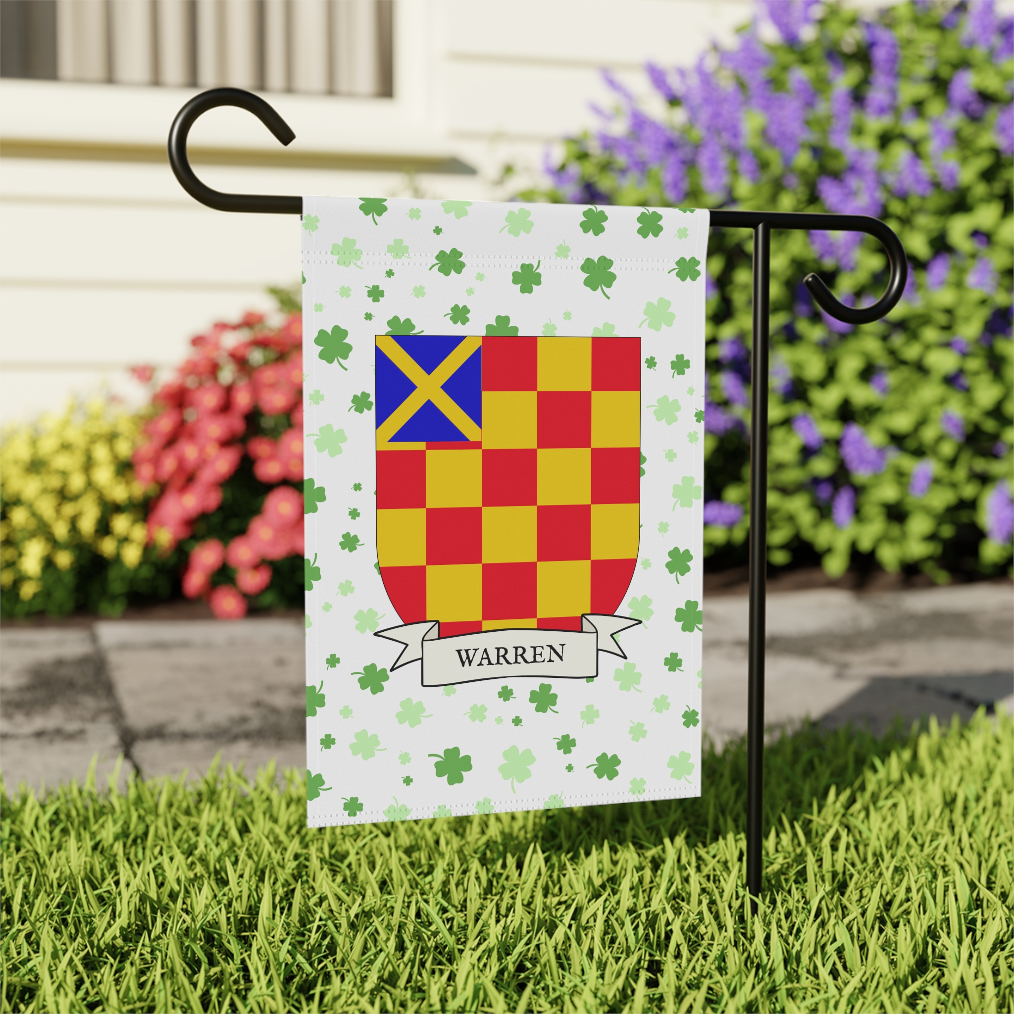 This welcoming Garden Banner will be a great addition to your garden or yard. It displays the Warren Family Coat of Arms over a subtle background showing a field of four-leaf shamrocks. Both sides show identical images.