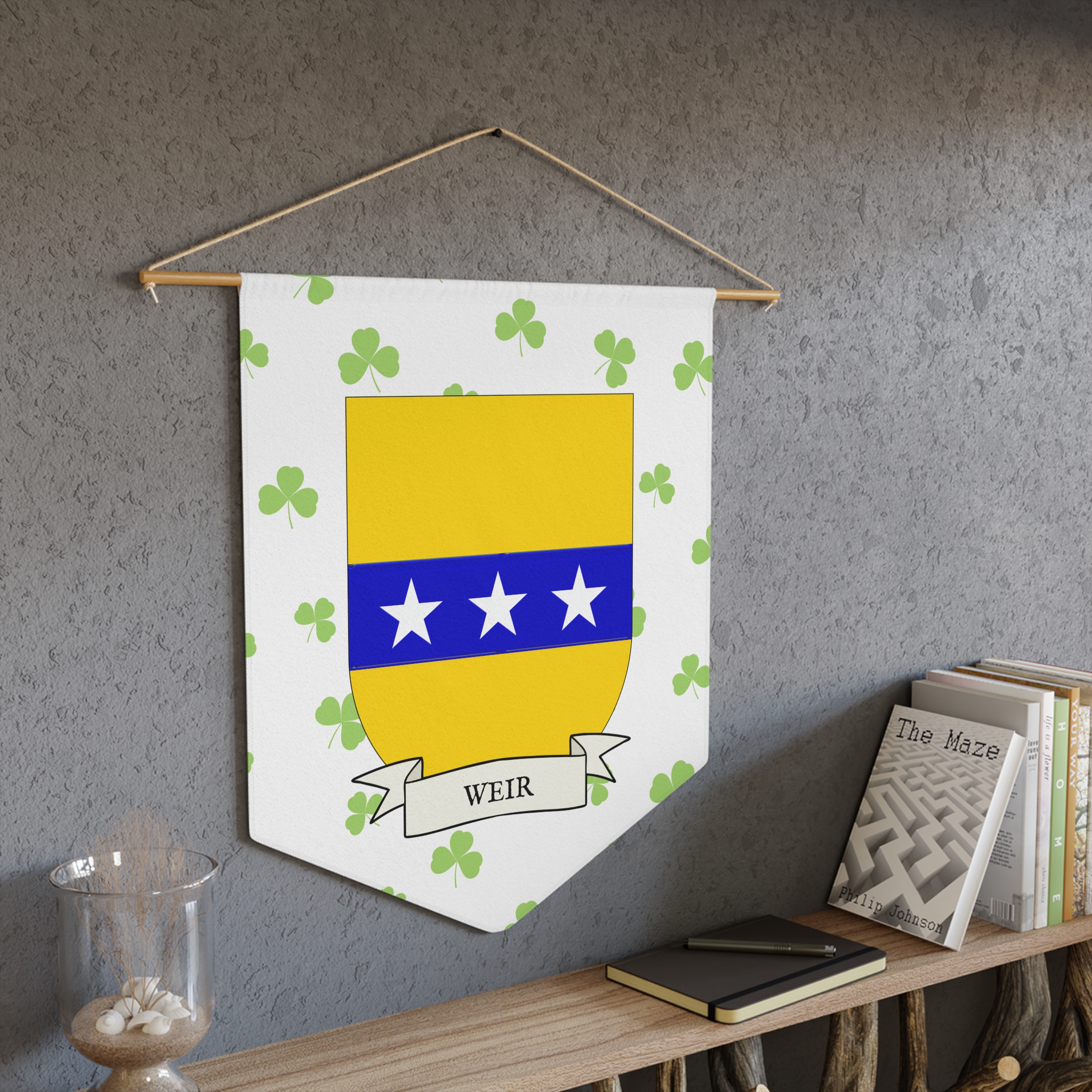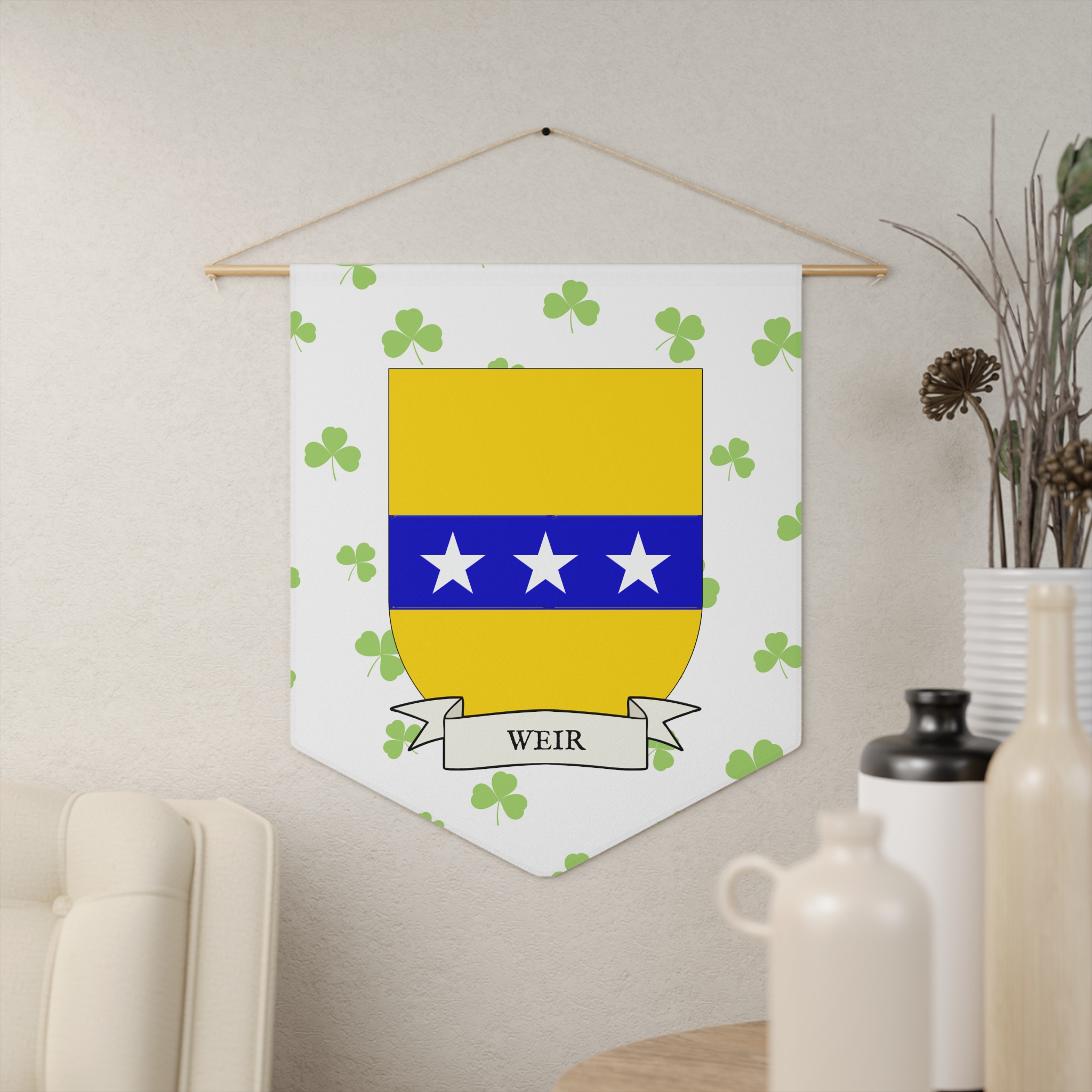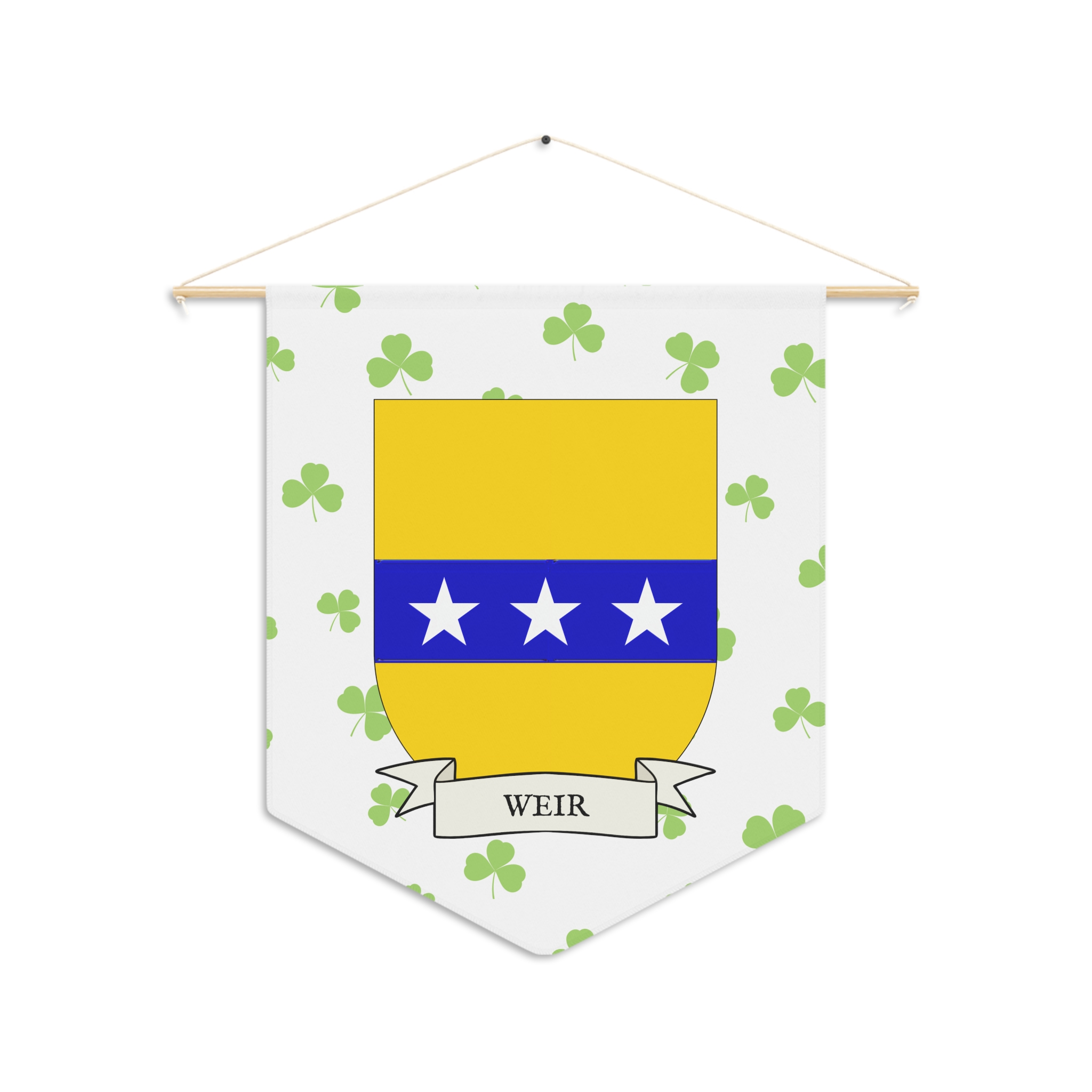 Uplift any room and show off your Irish American roots with this Weir Family Coat of Arms Indoor Pennant. Pennant is printed on durable poly twill and comes with a wooden dowel/twine frame for easy hanging. Features your family Coat of Arms printed over a restrained shamrock patterned background.
