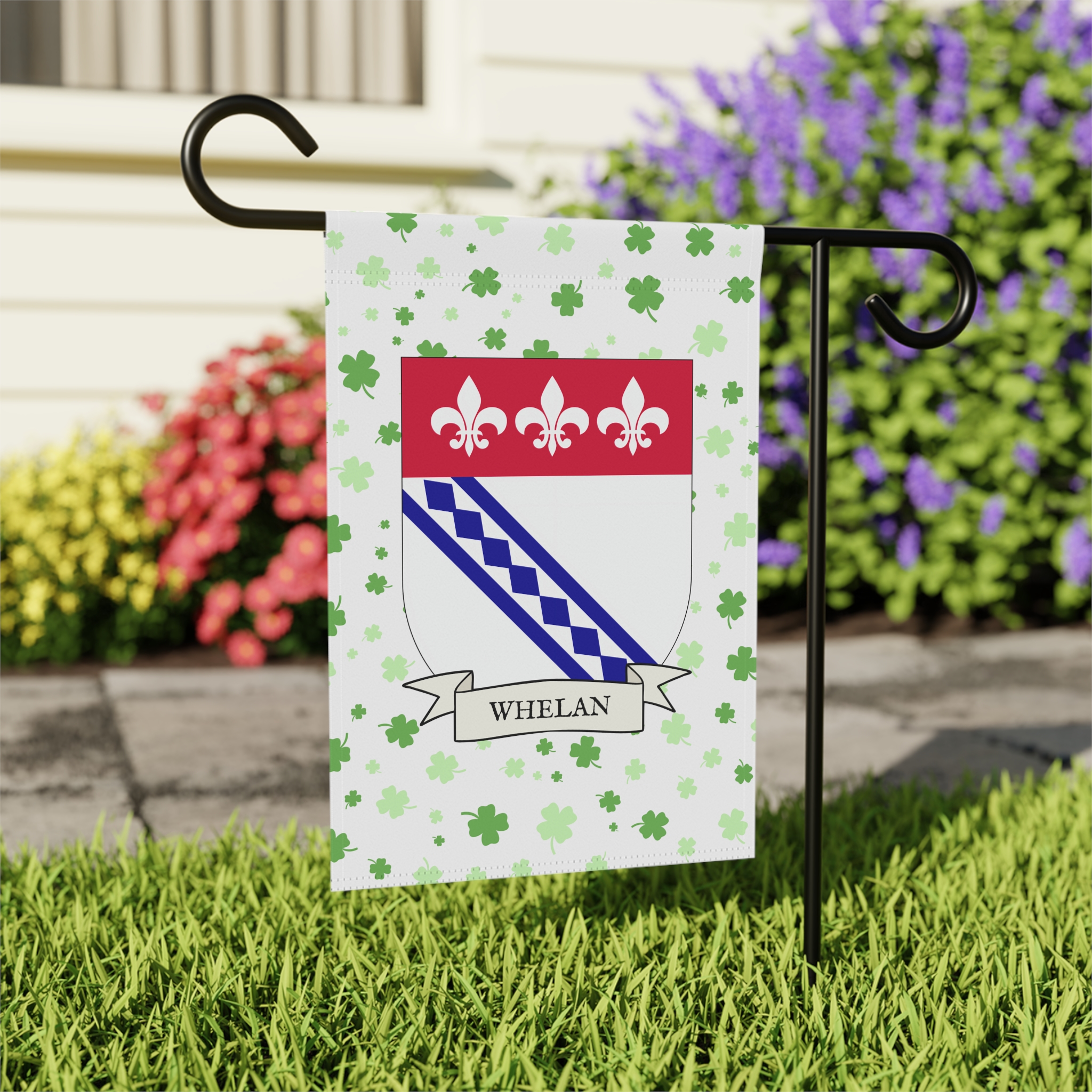 This welcoming Garden Banner will be a great addition to your garden or yard. It displays the Whelan Family Coat of Arms over a subtle background showing a field of four-leaf shamrocks. Both sides show identical images.