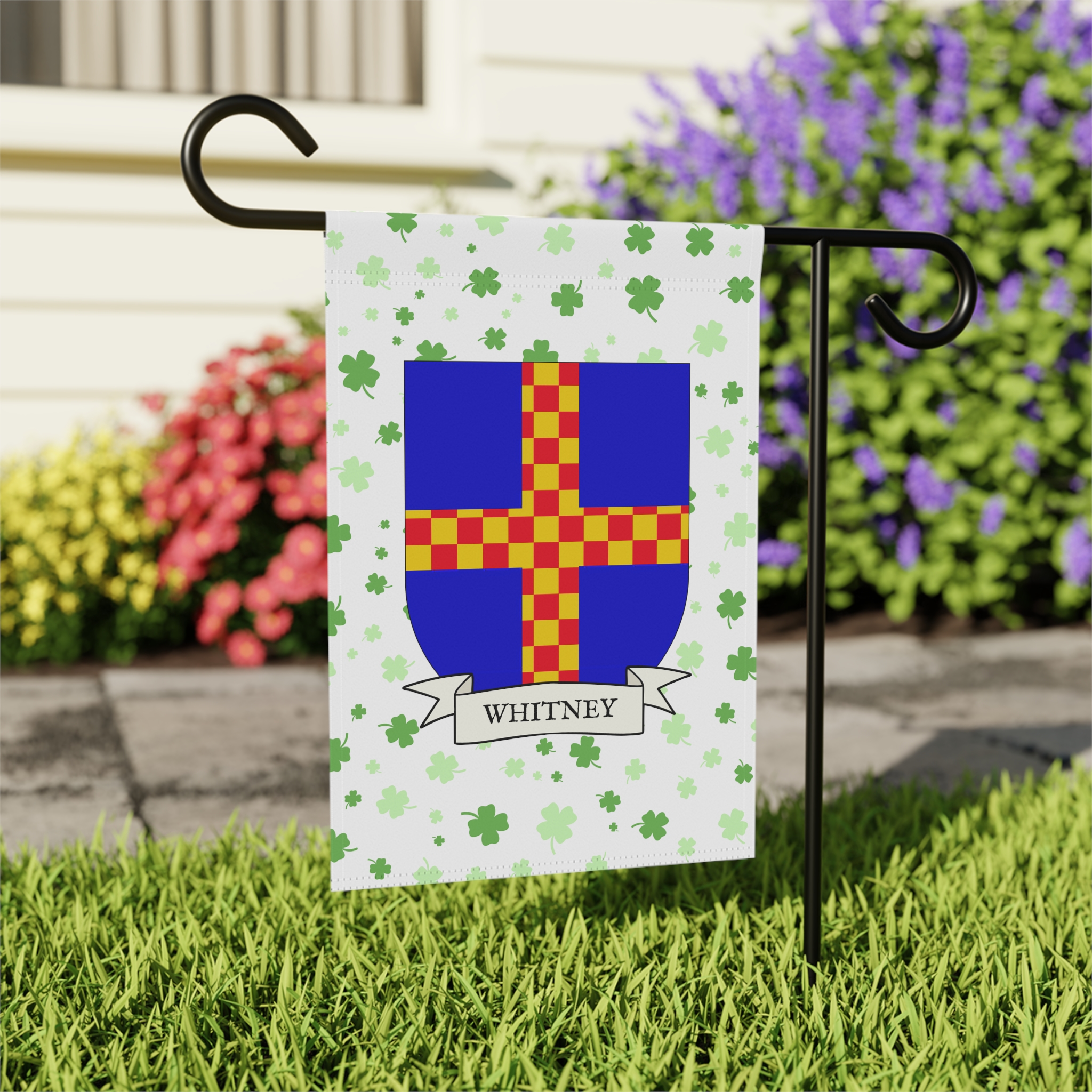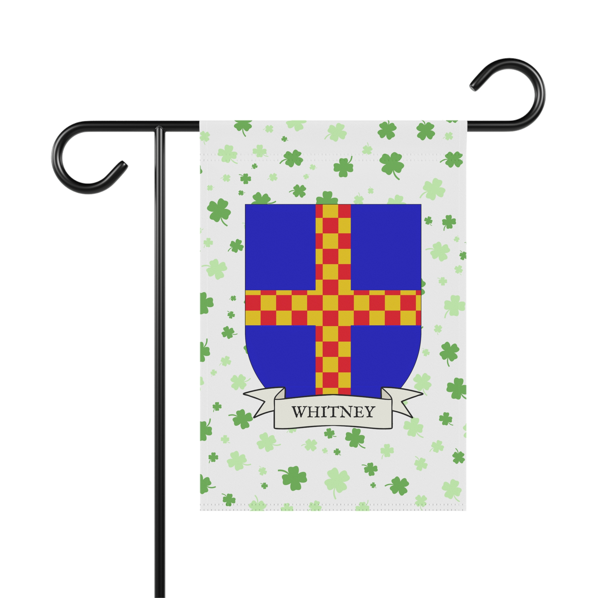 This welcoming Garden Banner will be a great addition to your garden or yard. It displays the Whitney Family Coat of Arms over a subtle background showing a field of four-leaf shamrocks. Both sides show identical images.