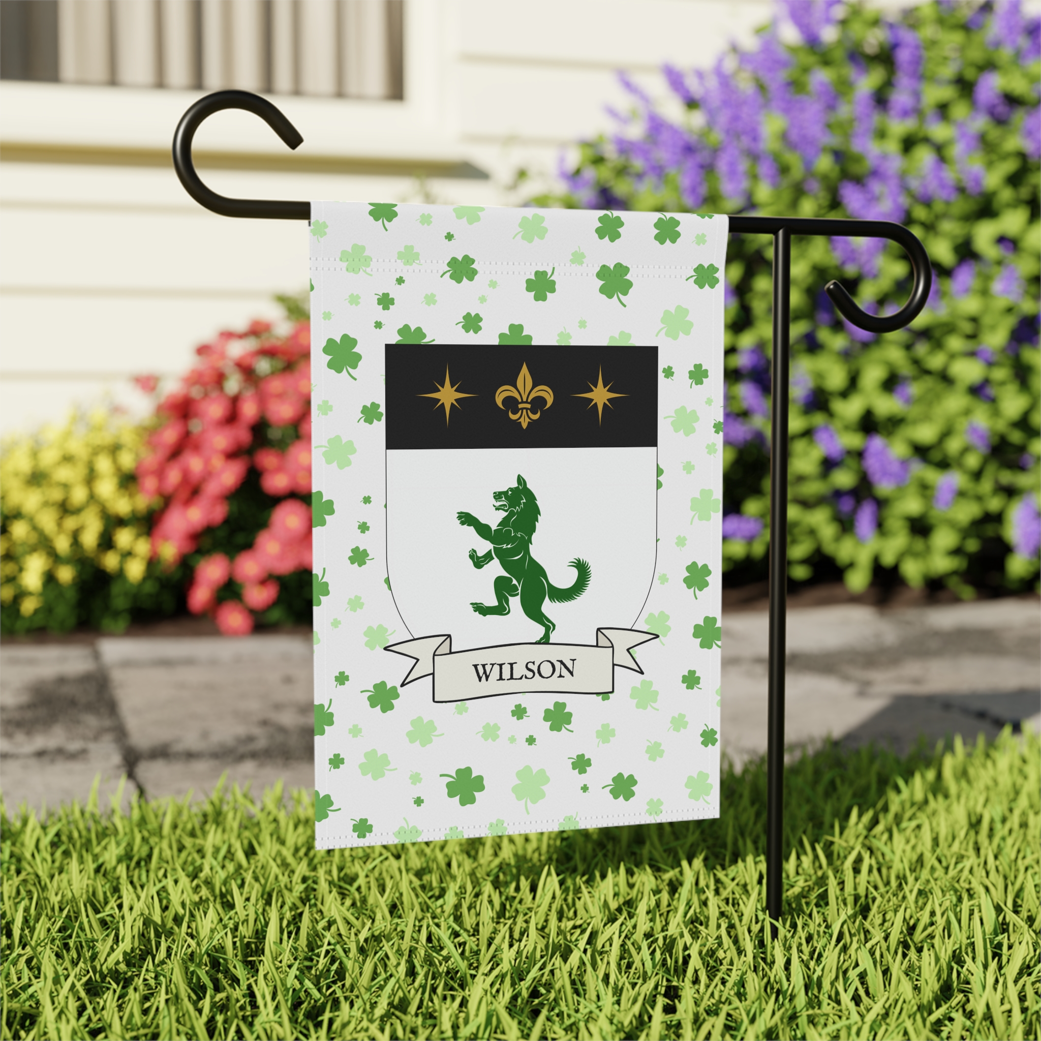 This welcoming Garden Banner will be a great addition to your garden or yard. It displays the Wilson Family Coat of Arms over a subtle background showing a field of four-leaf shamrocks. Both sides show identical images.