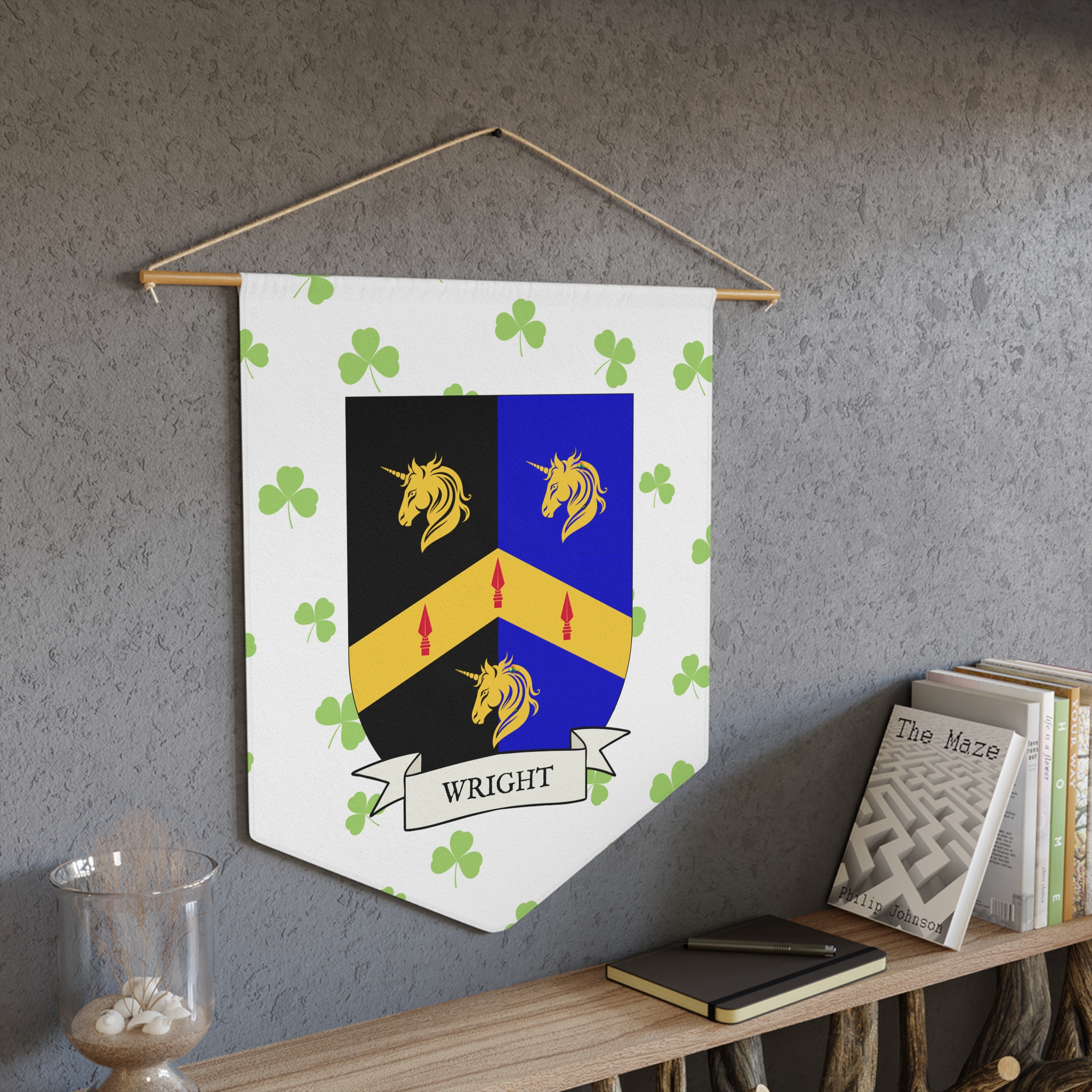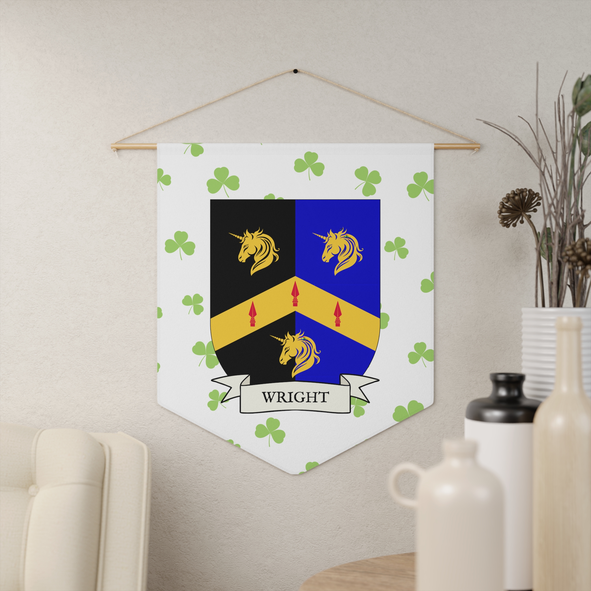 Uplift any room and show off your Irish American roots with this Wright Family Coat of Arms Indoor Pennant. Pennant is printed on durable poly twill and comes with a wooden dowel/twine frame for easy hanging. Features your family Coat of Arms printed over a restrained shamrock patterned background.